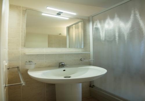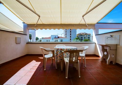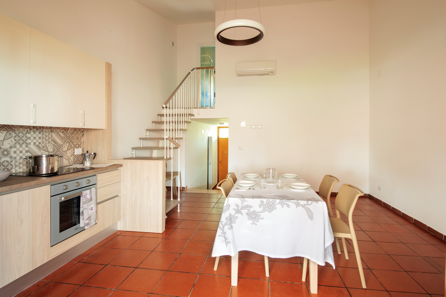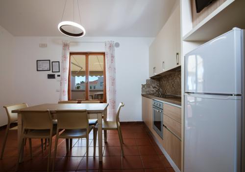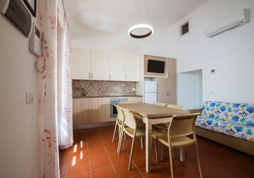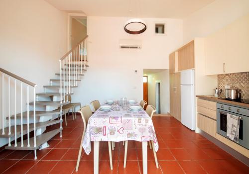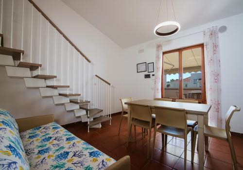 Die Wohnung besteht im unteren Bereich aus einem Schlafzimmer mit zwei Einzelbetten und einem kleineren Badezimmer (Waschbecken, Dusche und WC) sowie einem Wohnzimmer mit Doppelschlafsofa und einer Küchenzeile mit Induktionskochfeld. Im oberen Bereich befinden sich ein Schlafzimmer mit einem Doppelbett und einem Ausziehbett sowie ein zweites Badezimmer mit allen Annehmlichkeiten (Waschbecken, Dusche, Bidet und WC). Die Wohnung ist mit Klimaanlage, TV, Safe, Waschmaschine und WLAN ausgestattet. Die große Terrasse mit seitlichem Meerblick und Markise verfügt über einen Tisch und Stühle. Ein Garagenstellplatz ist vorhanden.