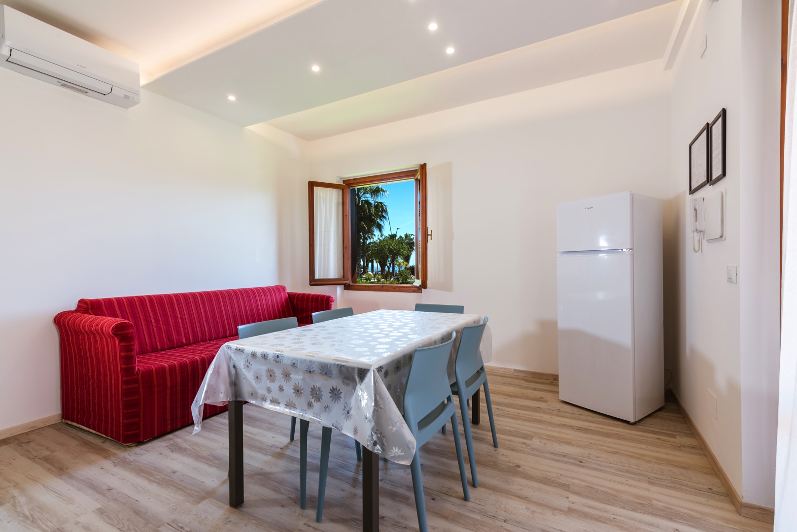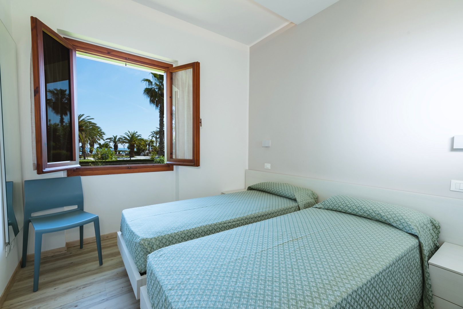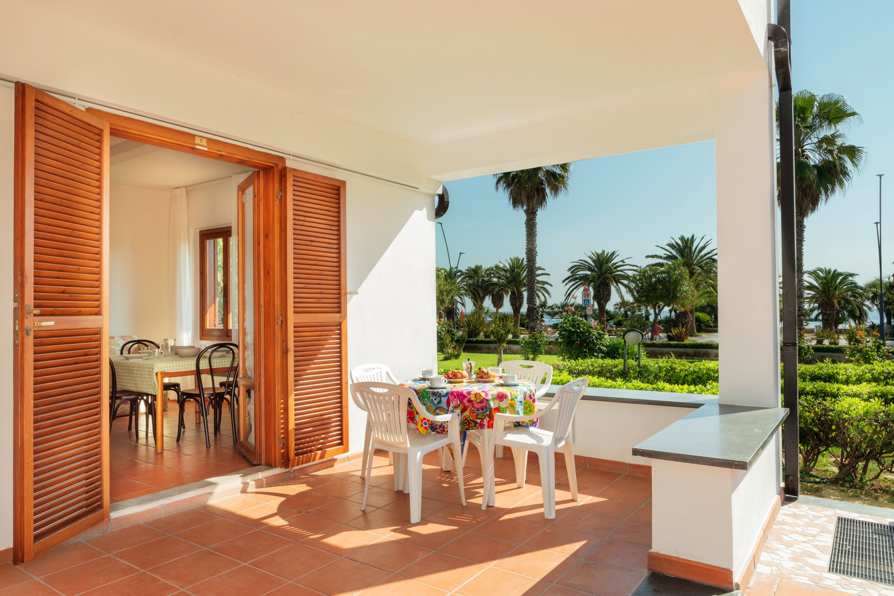 L'appartamento è composto da una camera con letto matrimoniale, una camera con due letti singoli e un bagno con finestra e tutti i comfort (lavandino, doccia, bidet e WC). Soggiorno con divano letto matrimoniale e angolo cottura. L'appartamento è dotato di aria condizionata, TV, cassaforte, lavatrice e Wi-Fi. La veranda esposta a sud è attrezzata con tavolo e sedie.