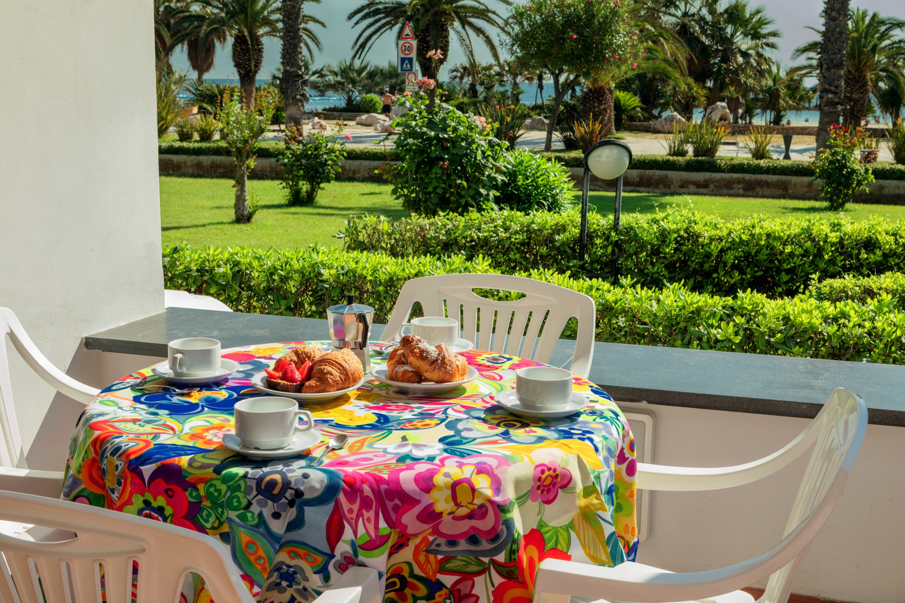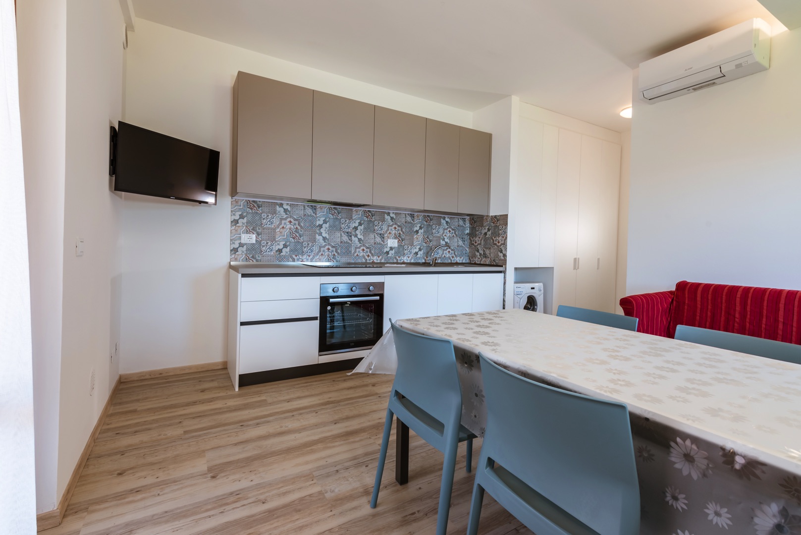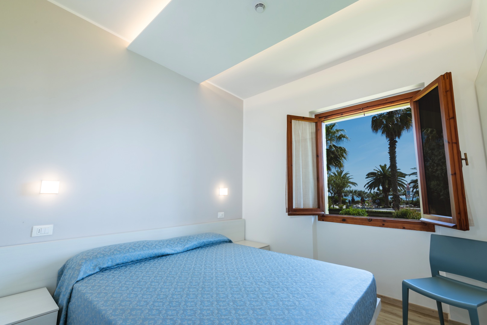 L'appartamento è composto da una camera con letto matrimoniale, una camera con due letti singoli e un bagno con finestra e tutti i comfort (lavandino, doccia, bidet e WC). Soggiorno con divano letto matrimoniale e angolo cottura. L'appartamento è dotato di aria condizionata, TV, cassaforte, lavatrice e Wi-Fi. La veranda esposta a sud è attrezzata con tavolo e sedie.