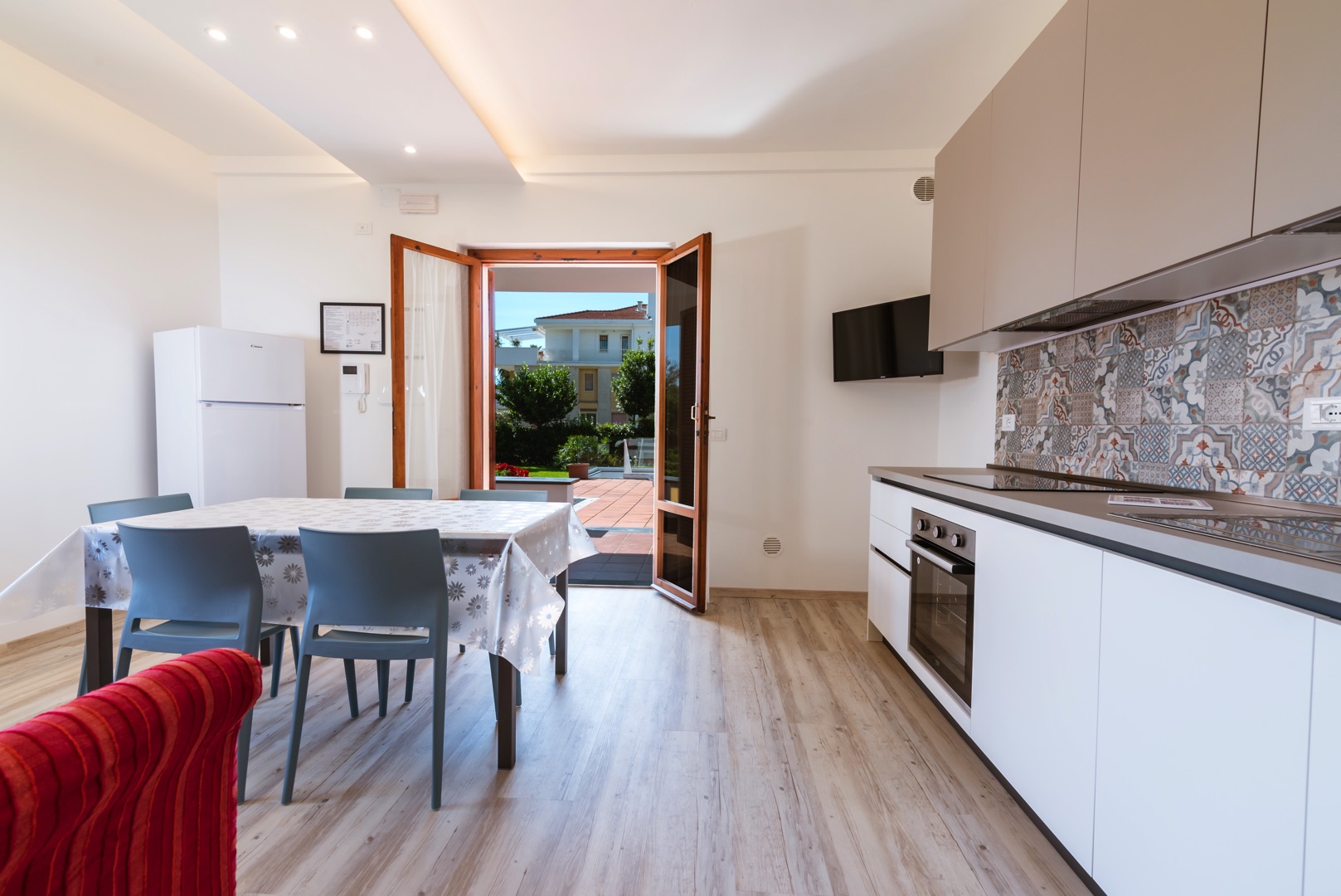 Appartamento trilocale int. 1 per 4-6 persone con vista mare, situato al piano terra e completamente ristrutturato.