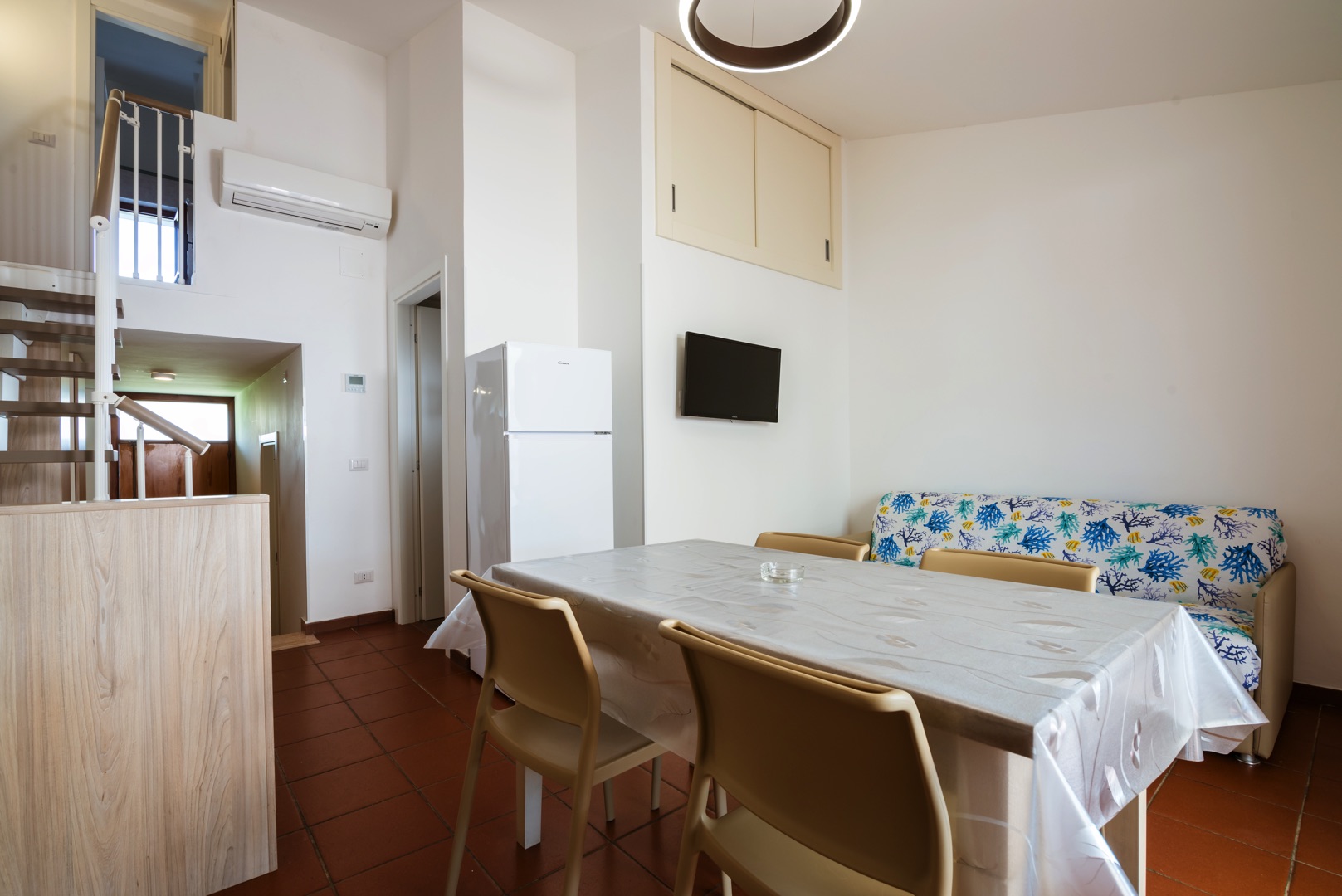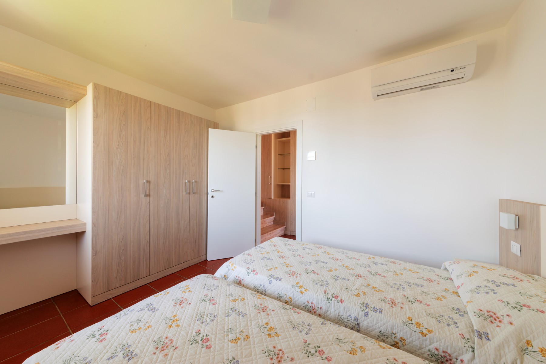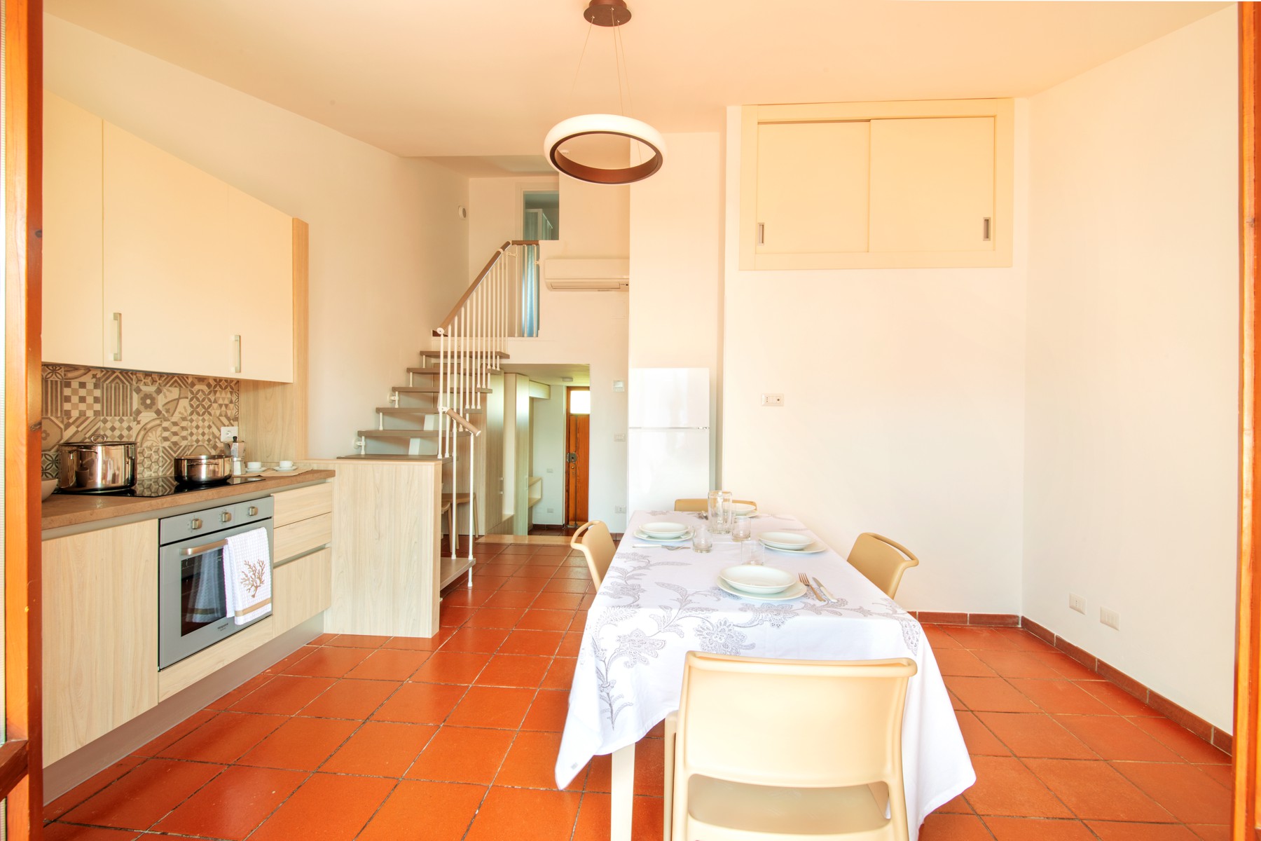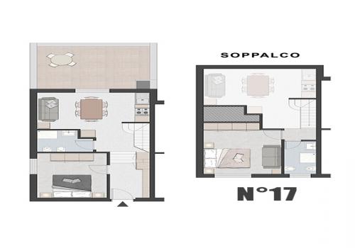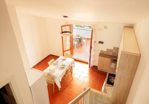 L’appartamento è composto su un livello da una camera con due letti singoli e un piccolo bagno (lavabo, cabina doccia e wc) e soggiorno con divano letto matrimoniale e angolo cottura con piano a induzione.Al secondo livello una camera matrimoniale + un letto a scomparsa e un secondo bagno completo di tutti i servizi (lavabo, cabina doccia, bidet e wc).