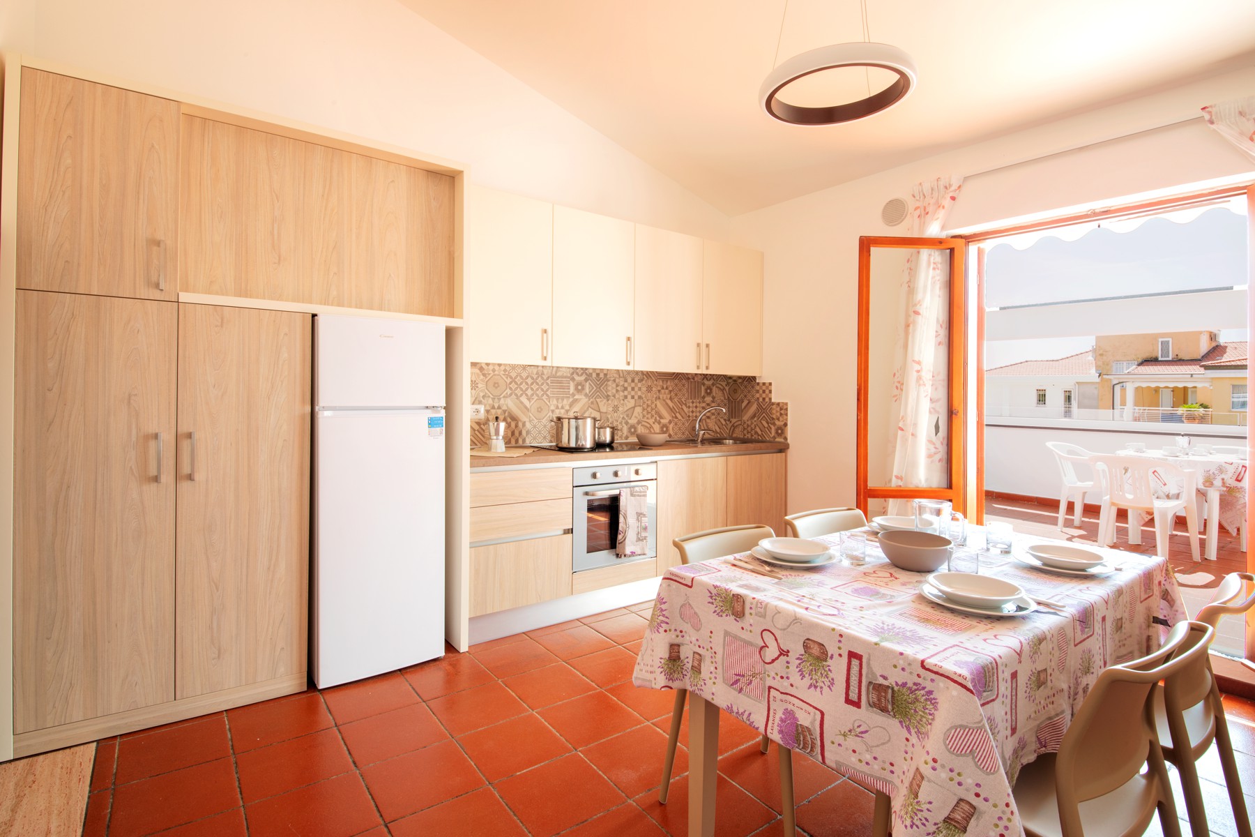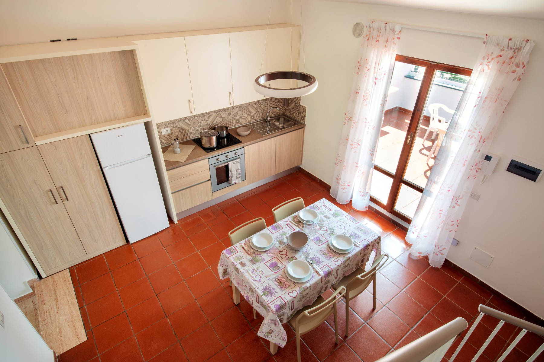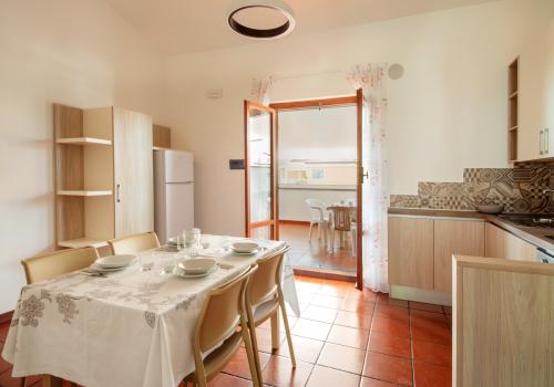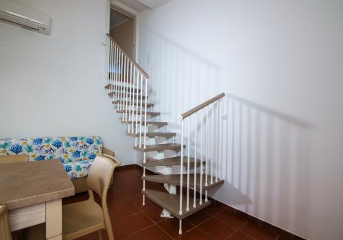 Апартаменты состоят из спальни с двумя односпальными кроватями и небольшой ванной комнаты (раковина, душ и туалет) на нижнем этаже, а также гостиной с двуспальным диваном-кроватью и мини-кухней с индукционной плитой. На верхнем этаже находится спальня с двуспальной кроватью и 1 раскладной кроватью, а также вторая ванная комната со всеми удобствами (раковина, душ, биде и туалет). Апартаменты оборудованы кондиционером, телевизором, сейфом, стиральной машиной и Wi-Fi. Большая терраса с прекрасным видом на море и навесом оборудована столом и стульями.
