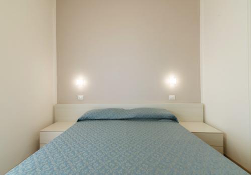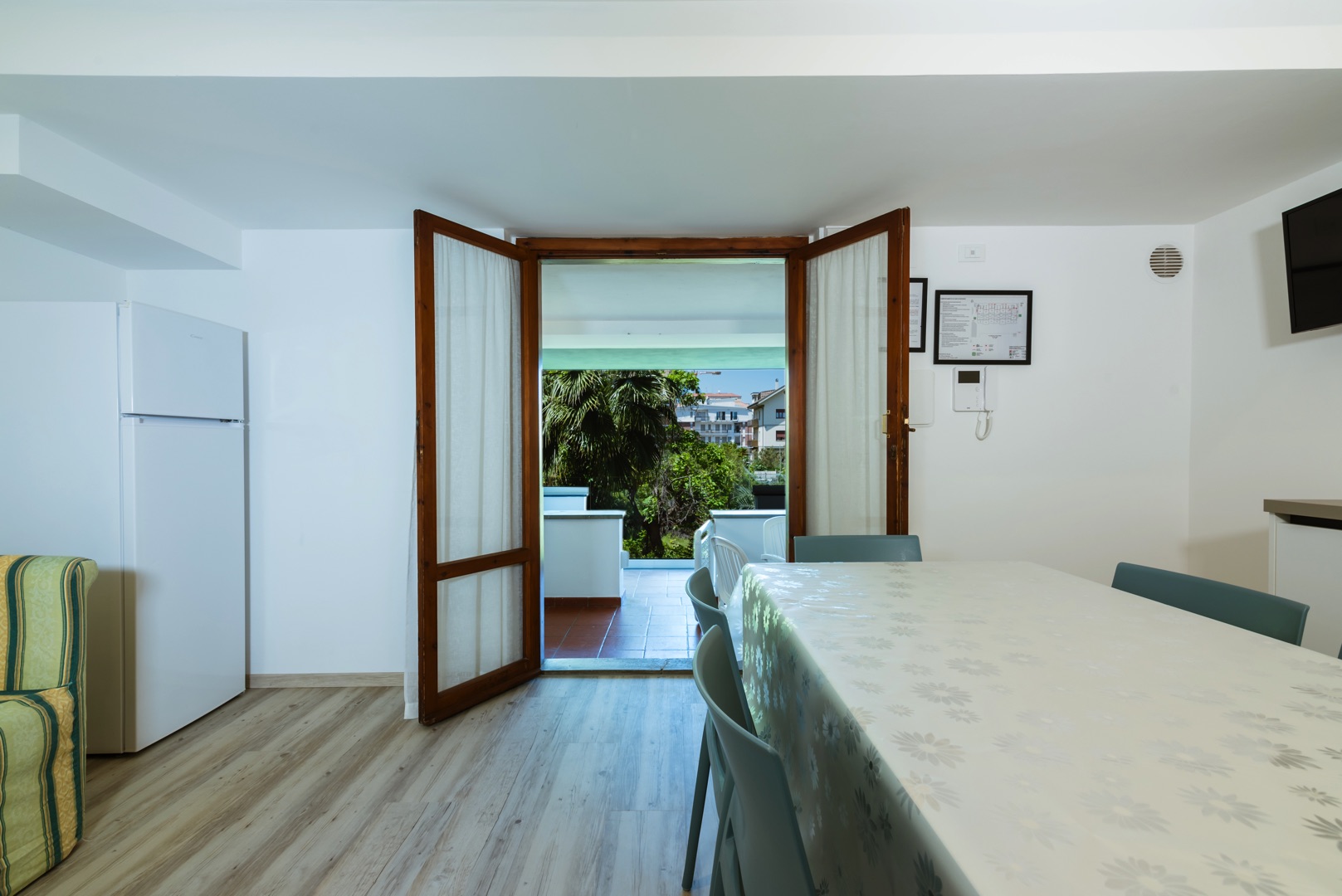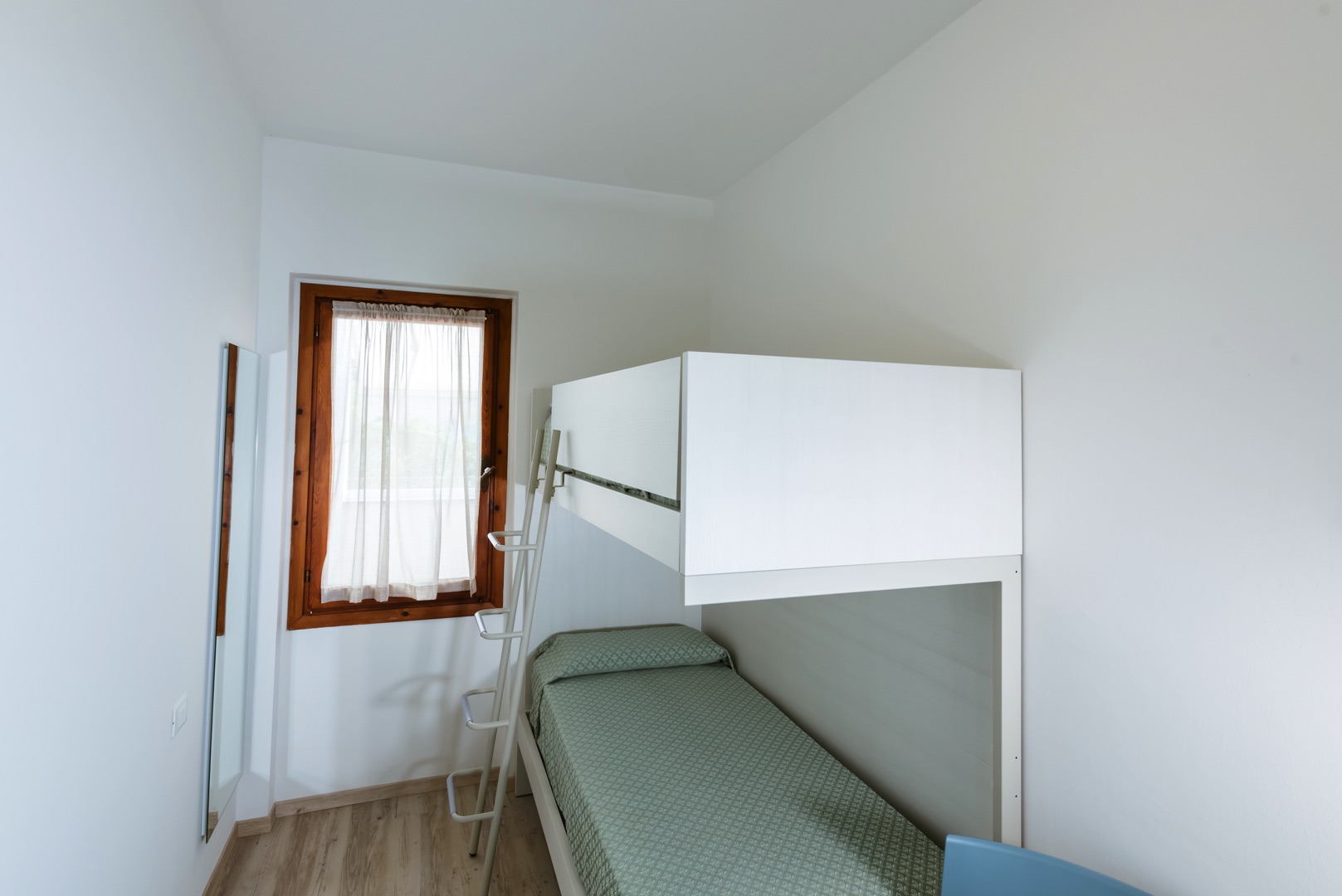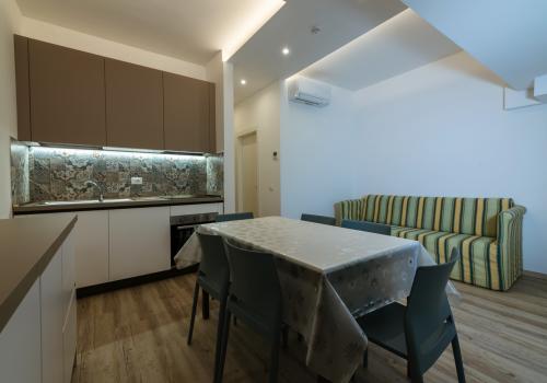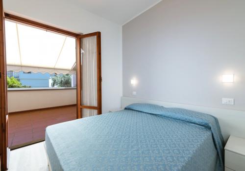 Апартаменты состоят из спальни с двуспальной кроватью, спальни с двухъярусной кроватью и односпальной кроватью, а также ванной комнаты с окном и всеми удобствами (раковина, душ, биде и туалет). Гостиная с двуспальным диваном-кроватью и мини-кухней. Апартаменты оборудованы кондиционером, телевизором, сейфом, стиральной машиной и Wi-Fi. Также имеется веранда, выходящая на север, со столом и стульями, и терраса, выходящая на юг, с боковым видом на море.
