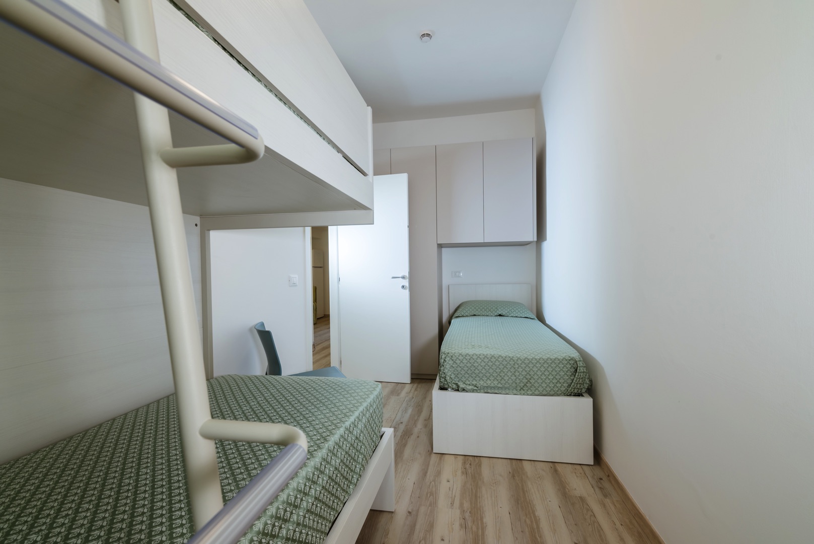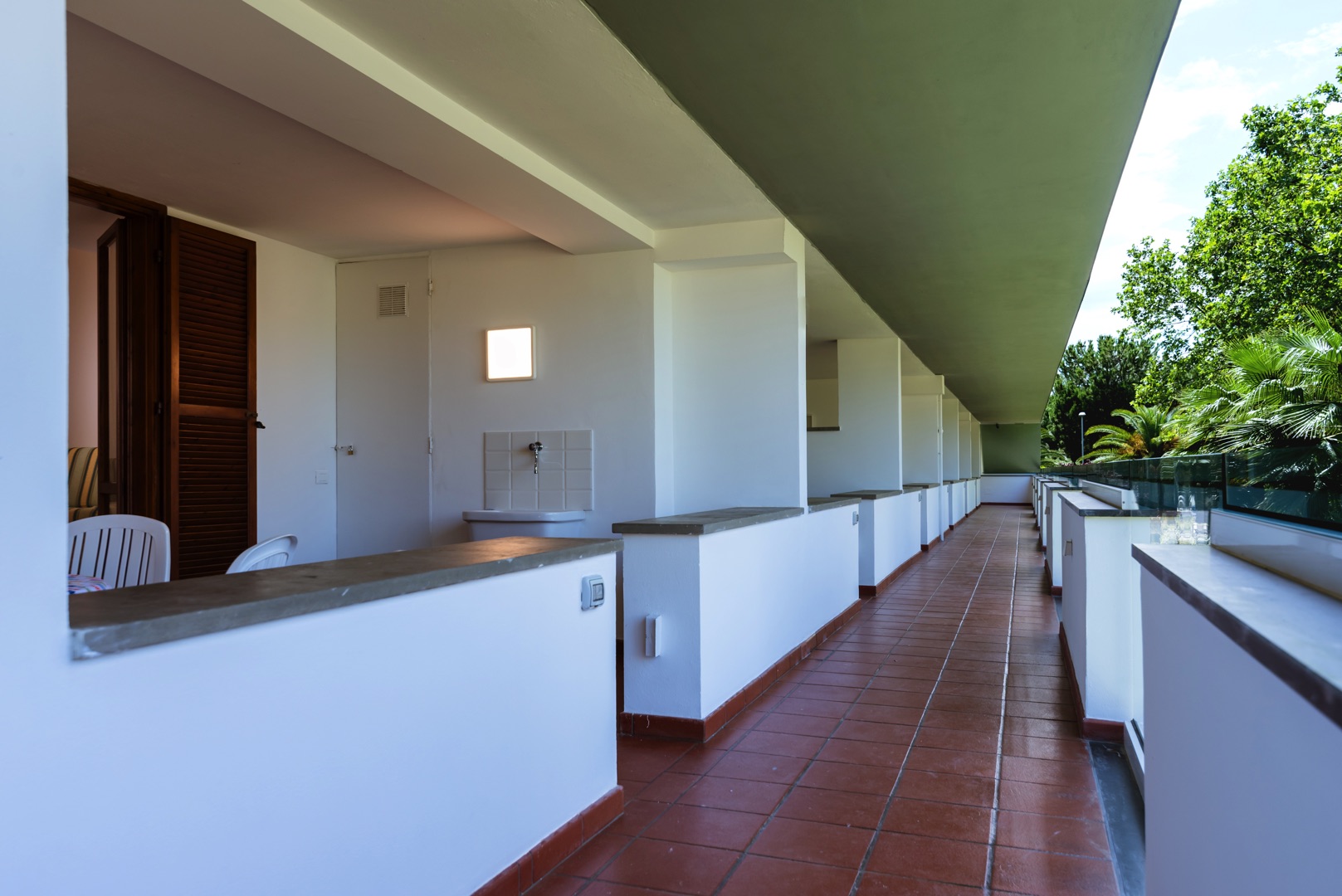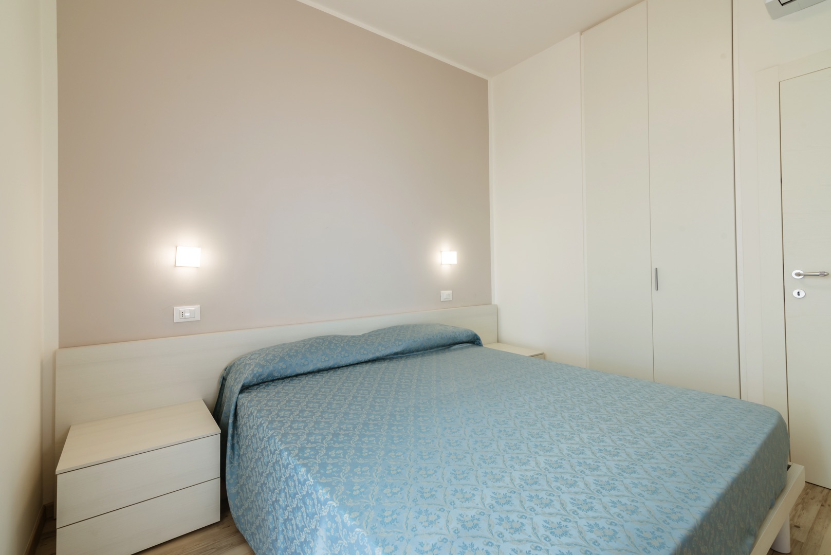 Апартаменты состоят из спальни с двуспальной кроватью, спальни с двухъярусной кроватью и односпальной кроватью, а также ванной комнаты с окном и всеми удобствами (раковина, душ, биде и туалет). Гостиная с двуспальным диваном-кроватью и мини-кухней. Апартаменты оборудованы кондиционером, телевизором, сейфом, стиральной машиной и Wi-Fi. Также имеется веранда, выходящая на север, со столом и стульями, и терраса, выходящая на юг, с боковым видом на море.
